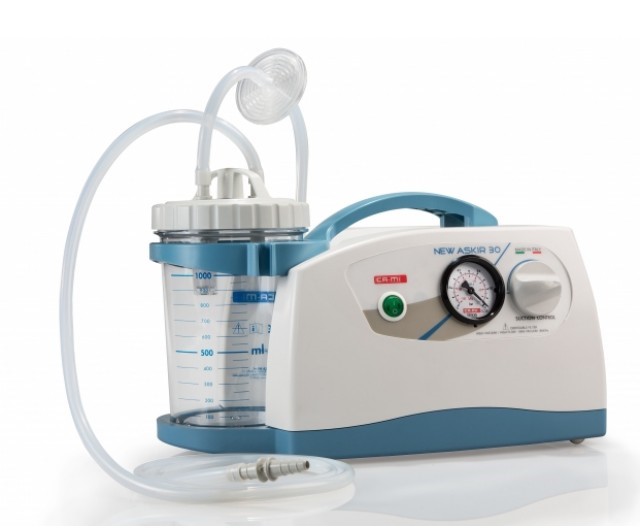NEW ASKIR 30 là một thiết bị hút điện kiểu bàn phù hợp với hút mũi, miệng và nội khí quản của dịch cơ thể (chất nhầy hoặc catarrh) từ người lớn và trẻ em. Chỉ định cho bệnh nhân mở khí quản, các ứng dụng tiểu phẫu và điều trị sau phẫu thuật trong chăm sóc tại nhà. Thiết bị chính được trang bị máy đo chân không (mmHg và kPa) và bộ điều chỉnh chân không.